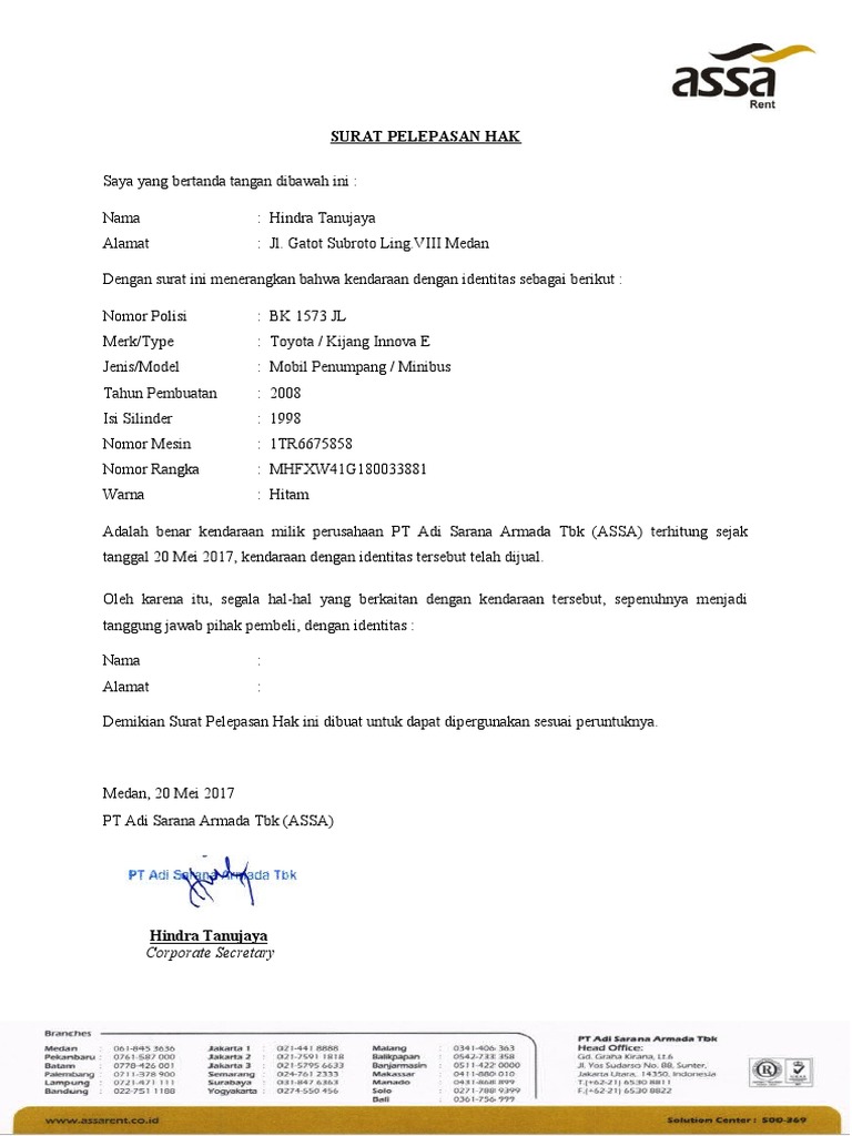 Download Contoh Surat Pelepasan Hak Mobil Dari Pt Kumpulan Surat